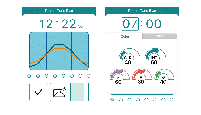 Simplifique la incorporación de nuevas luces a un acuario o de nuevos corales a una configuración existente con el modo de aclimatación. El cronograma de aclimatación se puede personalizar para adaptarse a necesidades específicas.
